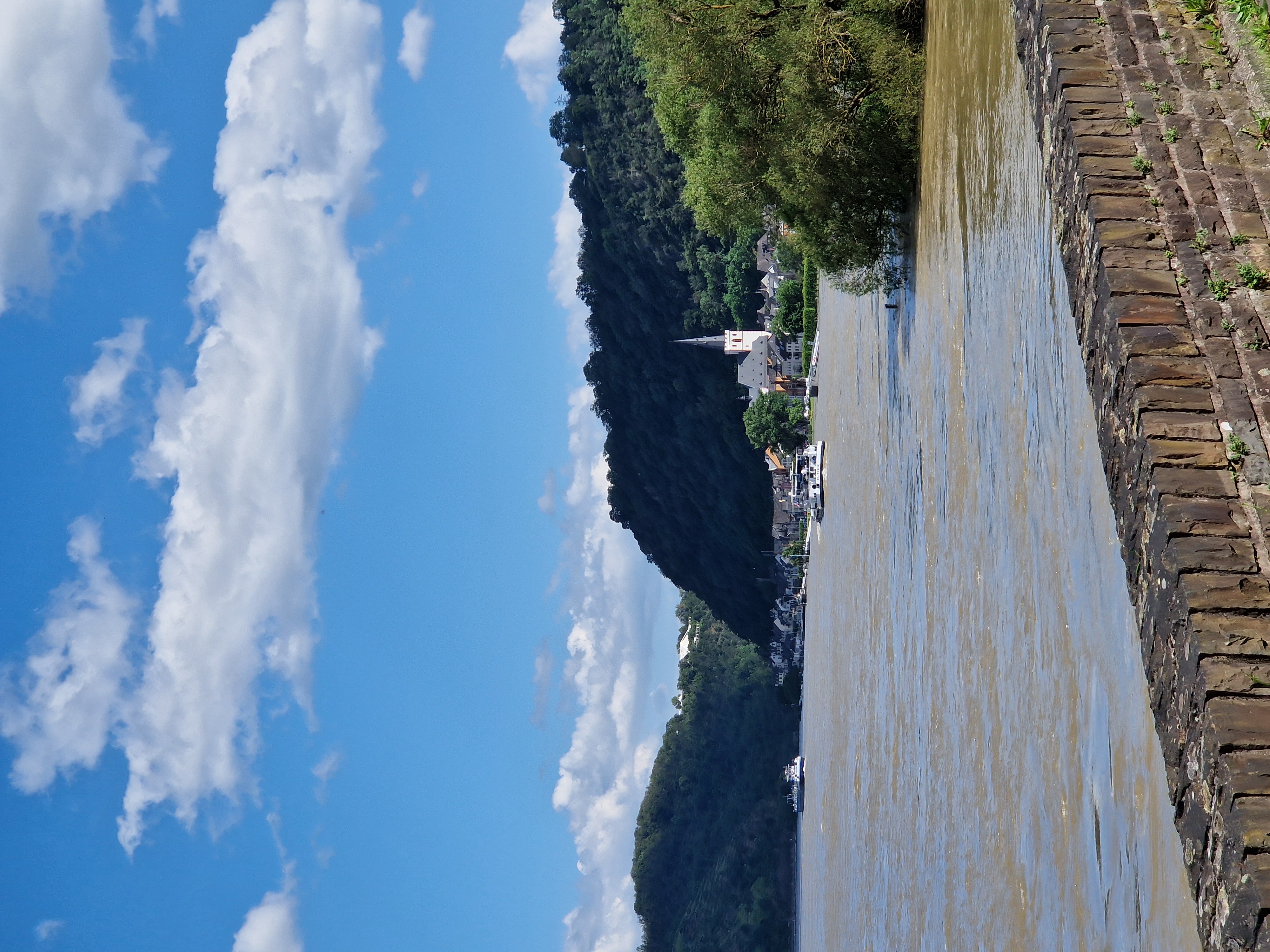 Enfin le soleil ce matin. Mais le Rhin déborde. Nous avons dû prendre le train. Pas facile. Heureusement un couple qui parlait allemand prenait aussi le train pour aller à Coblence.