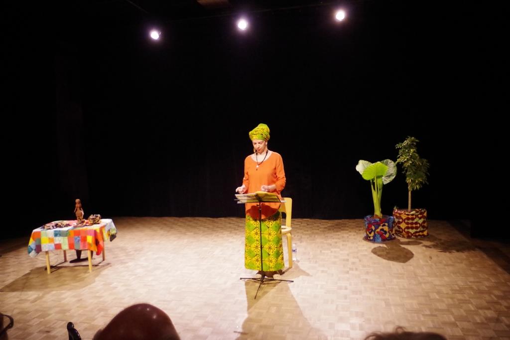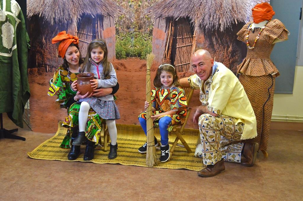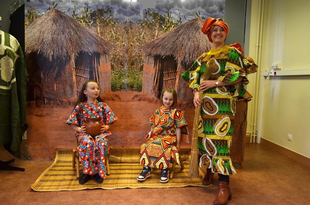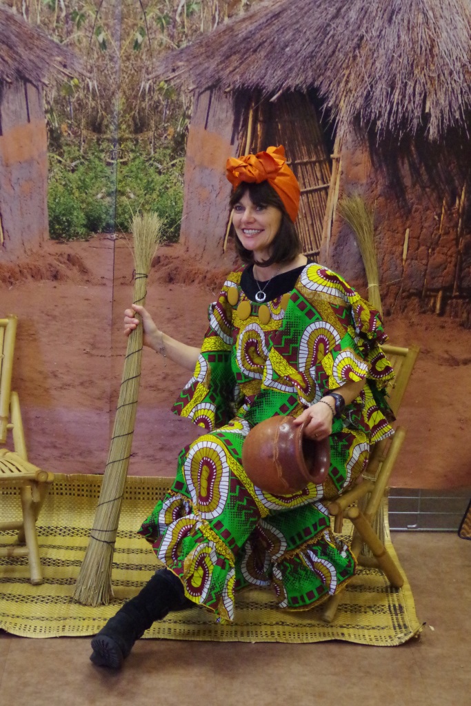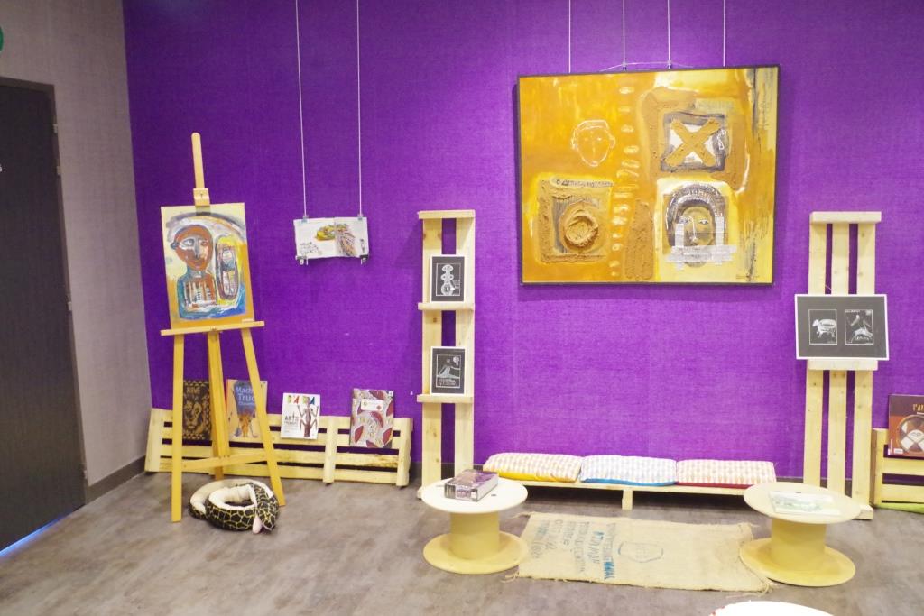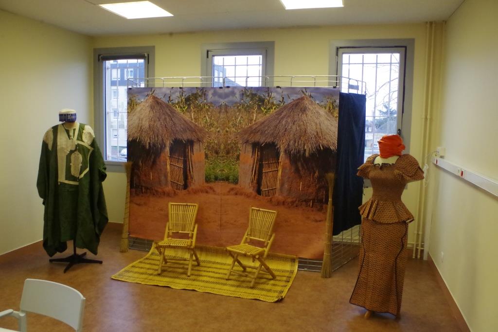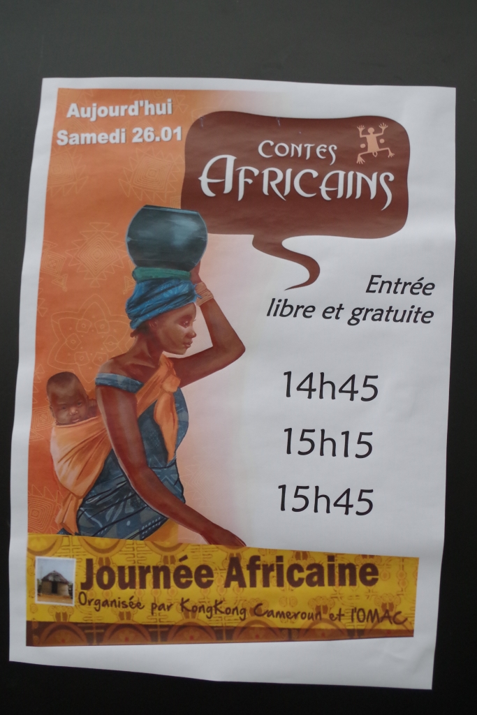 Dans la semaine qui a précédé la manifestation, l’équipe de la médiathèque avait mis en place un décor pour accueillir les conteurs et installer les tableaux du peintre camerounais Hako Hankson.