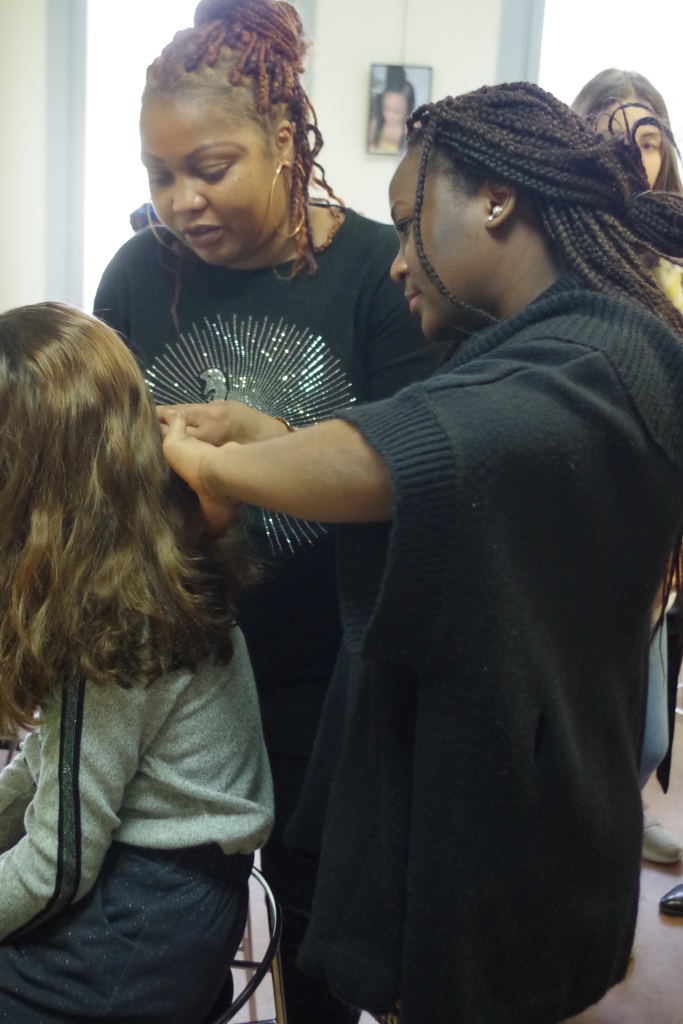 Une salle du centre culturel était aménagée en salon de coiffure africaine. 5 coiffeuses bénévoles ont mis beaucoup d’énergie à faire des tresses tout l’après-midi ….. La gagnante du jeu de la « tête coiffée » tirée au sort sur facebook a bénéficié d’une jolie coiffure.
