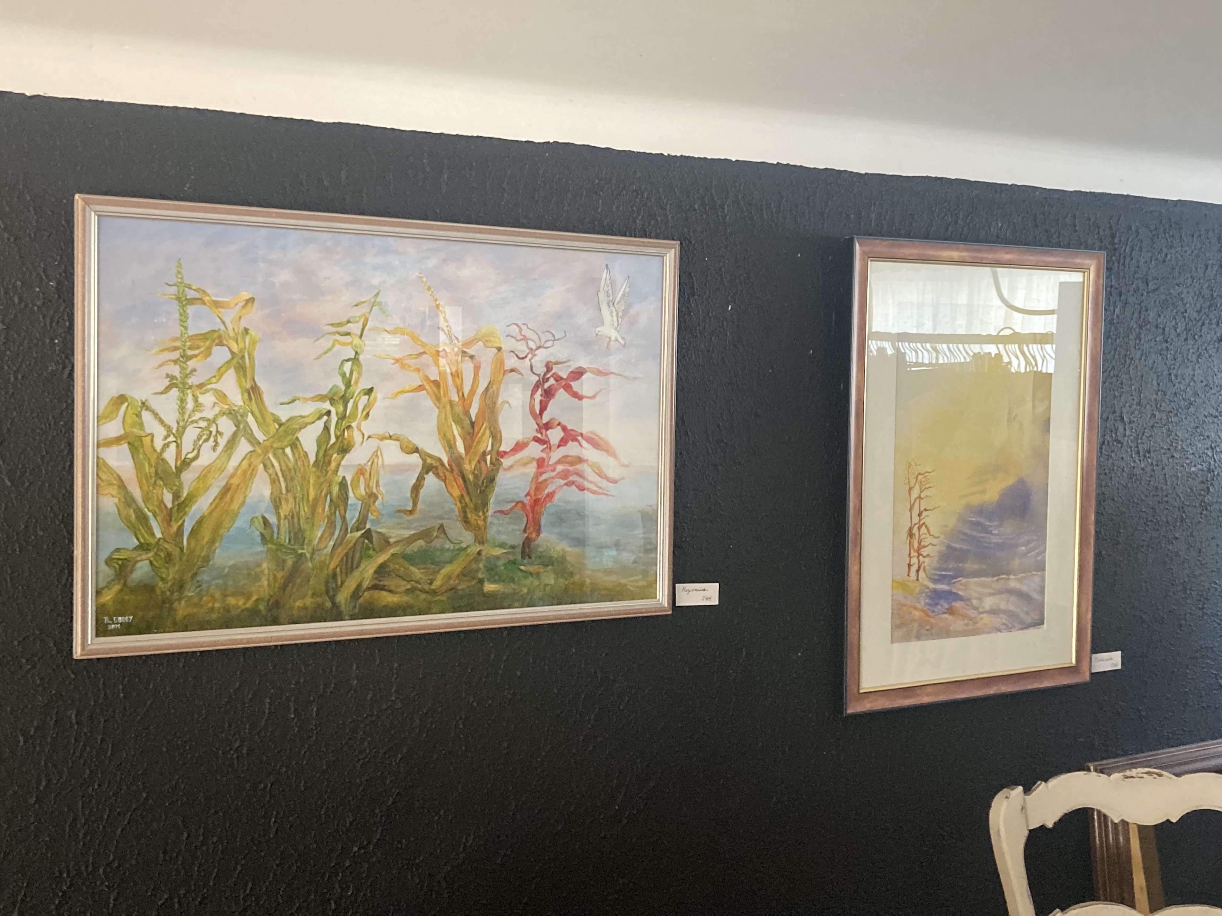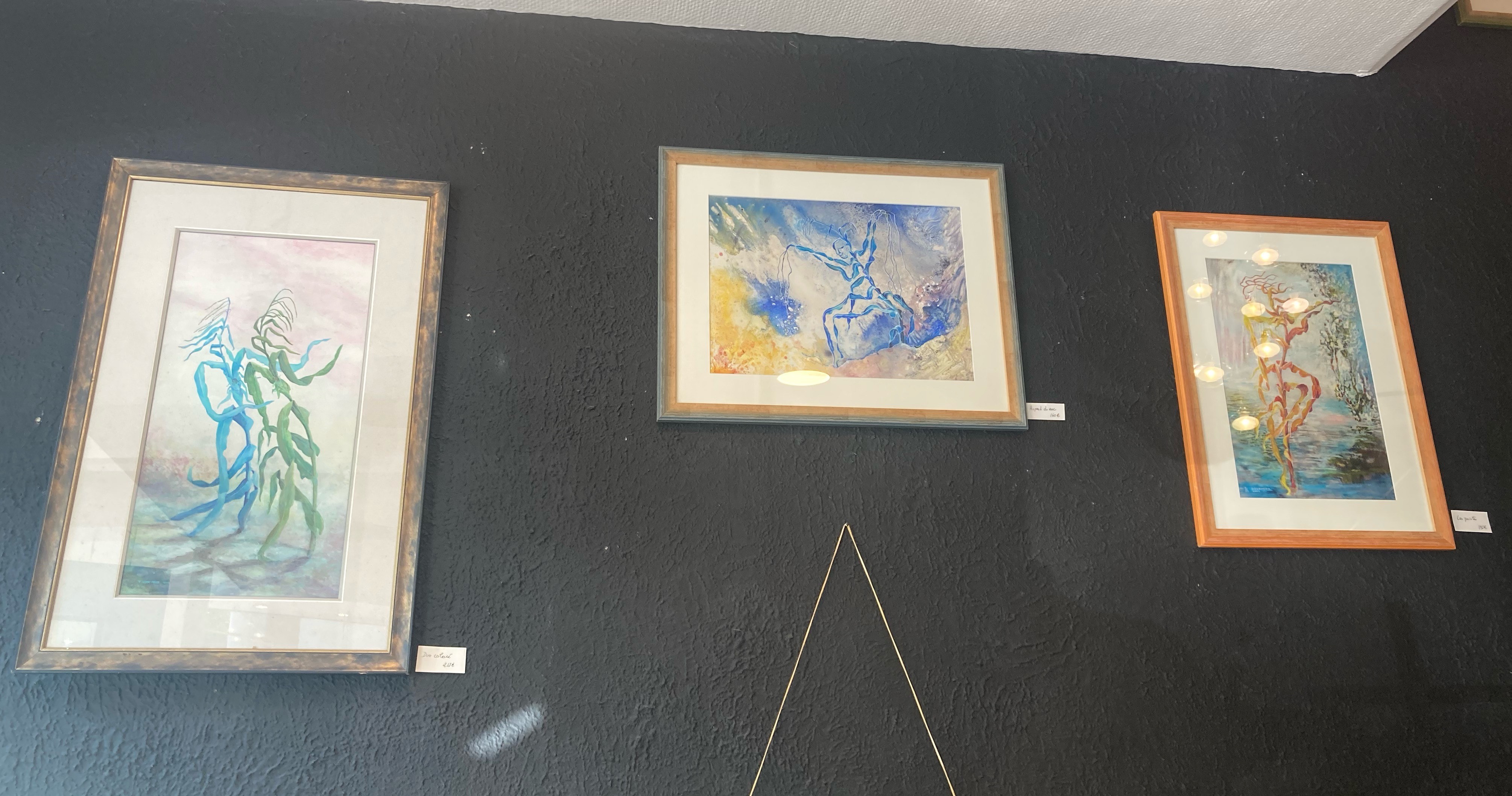 « Selon le thèmes choisis, j’utilise diverses techniques. Pour cette exposition dans la Boutique Entre Cigale et Fourmi, le titre en est « Le Chant d’Emmaïsse » qui aborde le thème du végétal personnifié, avec la technique de l’encre évoquant surtout le mouvement »