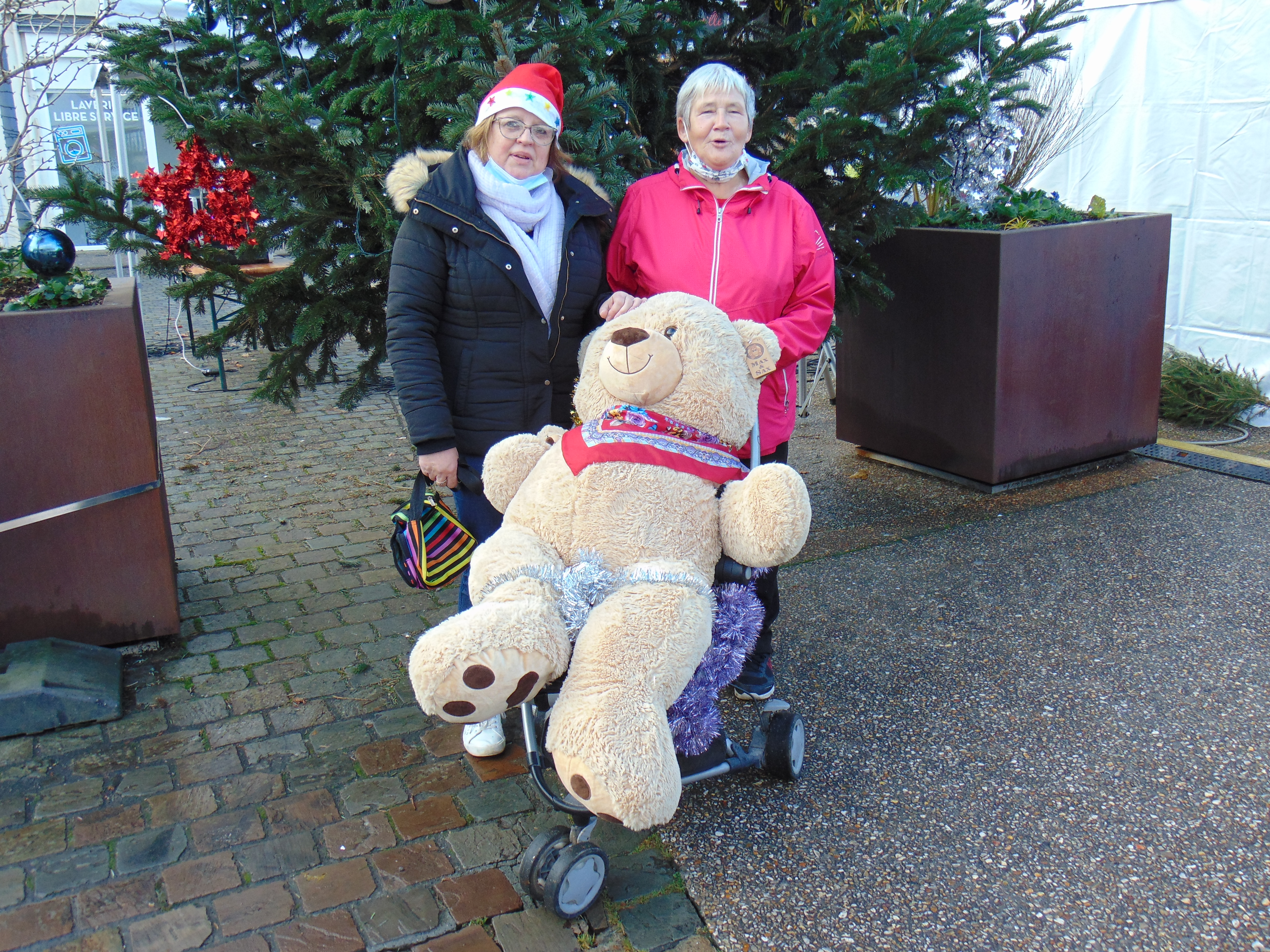 - Florence et Catherine promènent l’ours.à gagner dans le cadre de la tombola