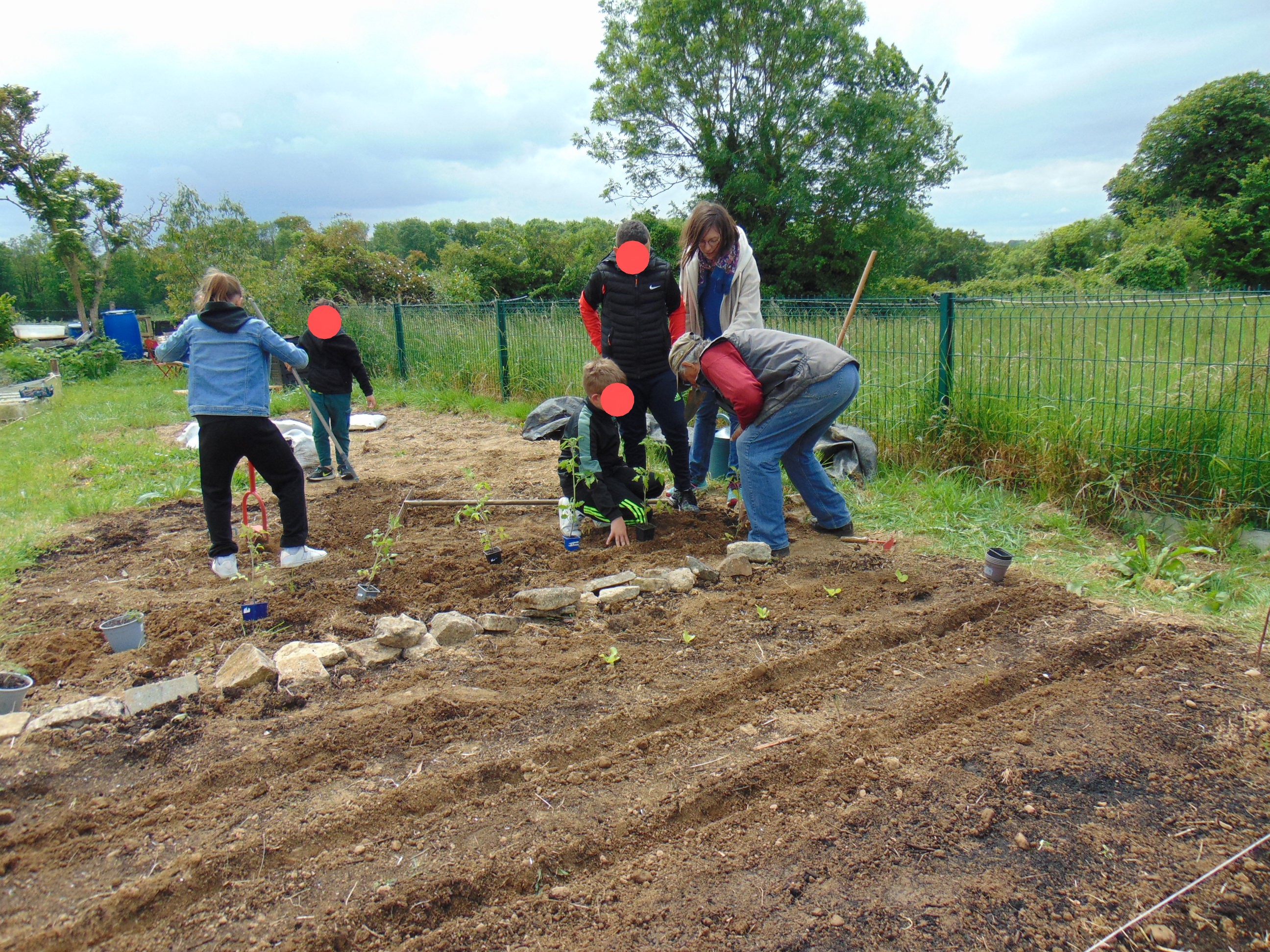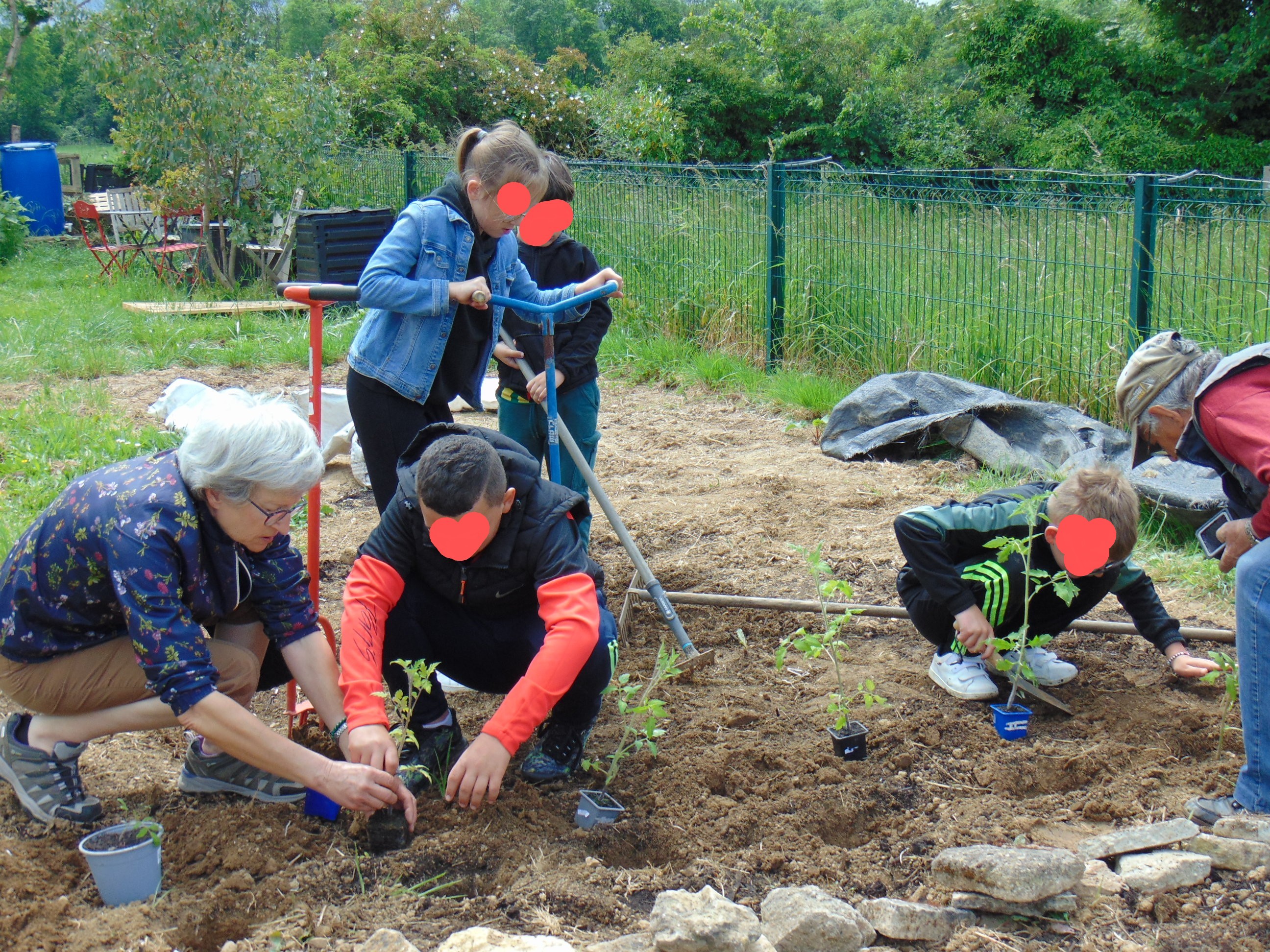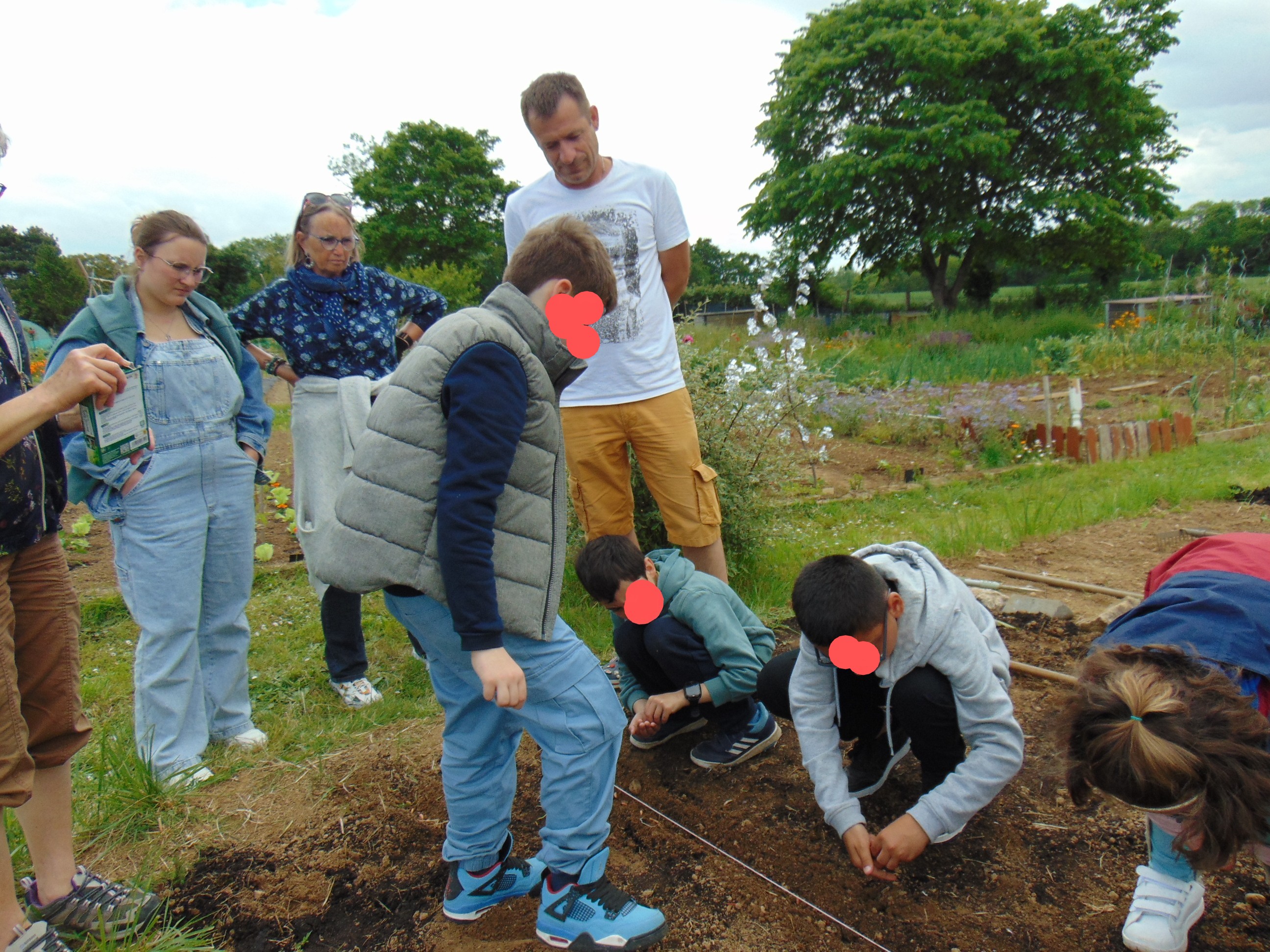 Mme Pichot, institutrice de la classe ULIS de l’école Colbert, est venue avec les 11 enfants de sa classe  pour leur apprendre à travailler la terre et à ensemencer  petites et grosses graines.