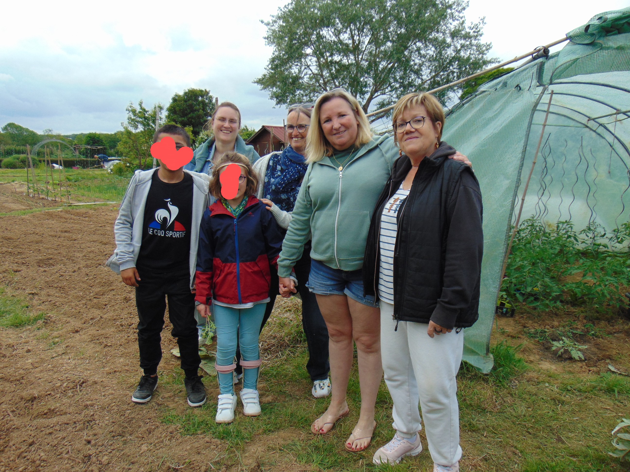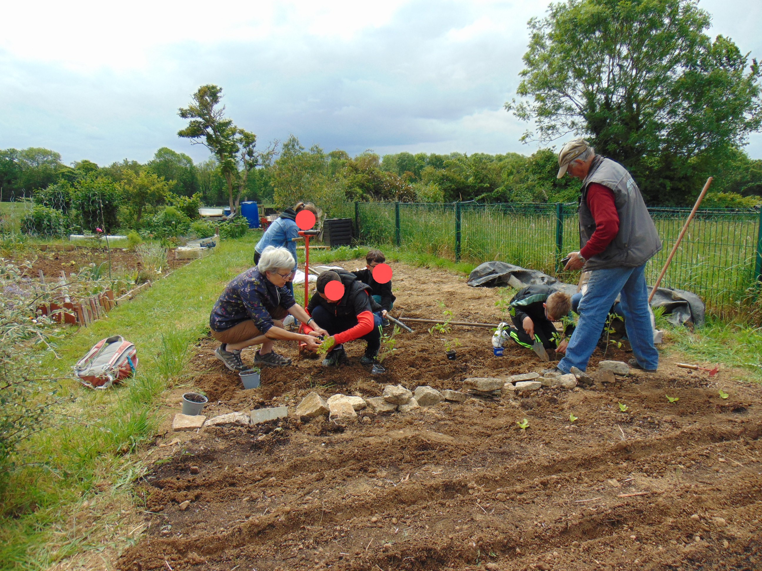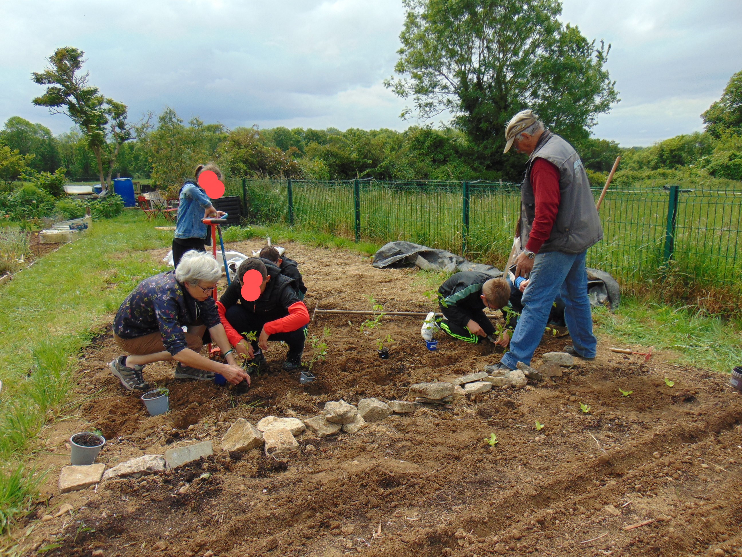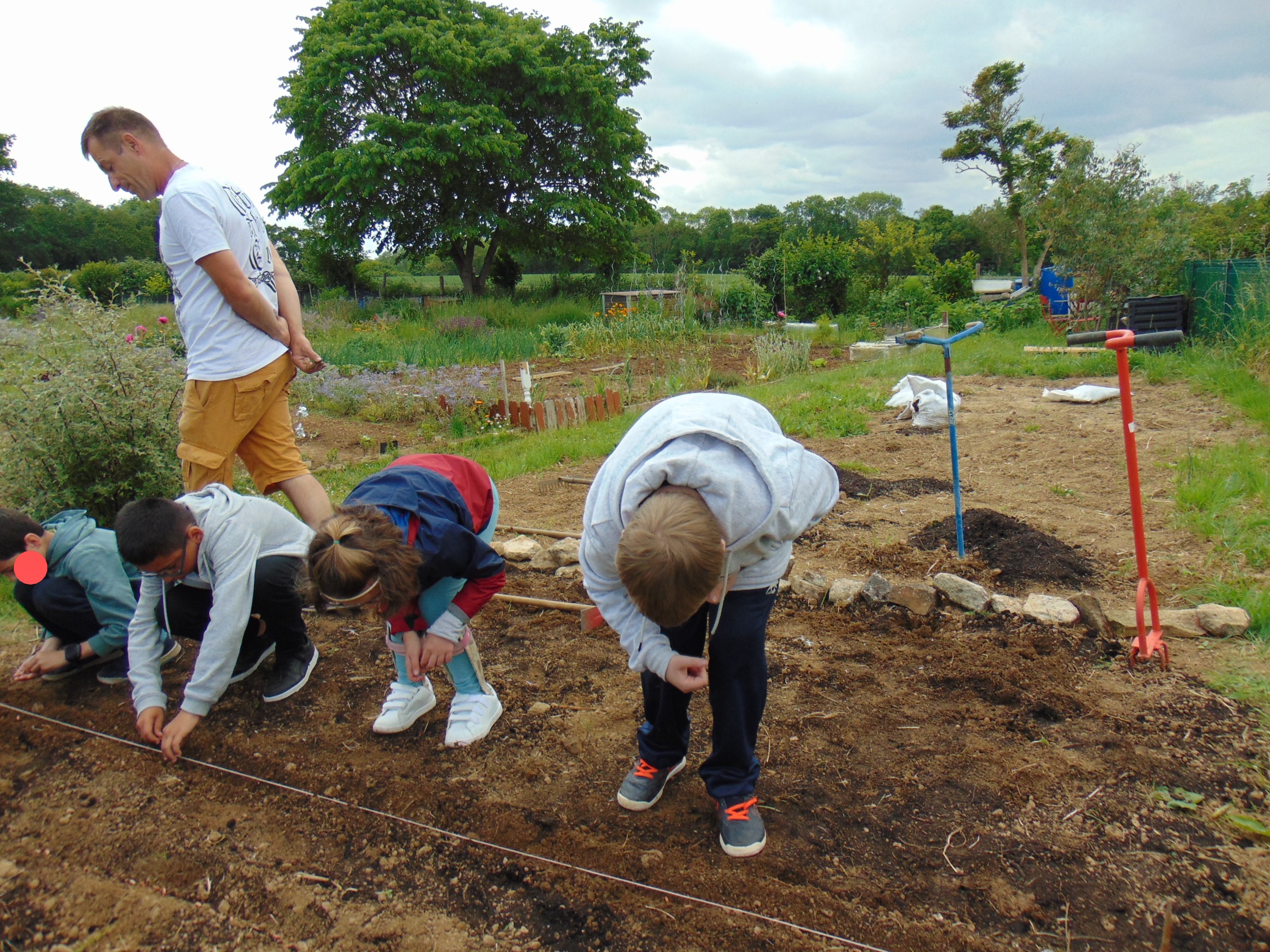 Mme Pichot, institutrice de la classe ULIS de l’école Colbert, est venue avec les 11 enfants de sa classe  pour leur apprendre à travailler la terre et à ensemencer  petites et grosses graines.